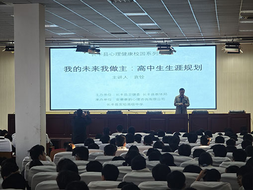 2025年11月5日下午,长丰县卫健委、长丰县教育体育局携手安徽徽韵心理咨询有限公司开展2025年“心理健康进校园”活动,邀请国家二级心理咨询师袁铨老师走进长丰县实验高级中学,为高一、高二年级全体学生开展了一场主题为“我的未来我做主”的高中生生涯规划心理健康讲座。旨在帮助学生走出“学习为何”的困惑,引导他们在高中阶段树立清晰的生涯目标,科学规划未来发展路径。