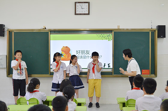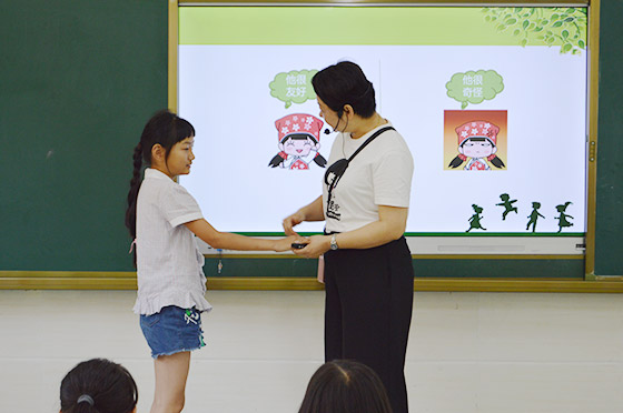 在接下来的讲座中,胡老师通过课堂理论和实战演练相结合的方式,帮助同学们了解潜在的可能会出现性侵的危机场景以及可能会对我们产生伤害的人群。在真的遇到危机事件时怎么办呢?胡老师告诉孩子们首先不要惊慌,在人多的地方可以大声的呼救,如果是在人烟稀少的地方首先要保证自己的安全,伺机而动。为了给孩子们加深印象,胡老师邀请孩子们来到讲台前进行角色扮演,将课堂所学应用到模拟的情境当中。