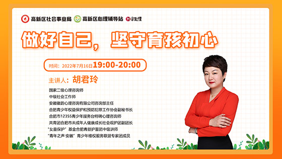 2022年7月16日,由高新区社会事业局、高新区校外未成年人心理健康辅导站主办,安徽徽韵心理咨询有限公司承办的暑期家庭教育系列课程如期开展。第1讲“做好自己,坚守育孩初心”邀请到国家二级心理咨询师胡君玲老师主讲,与高新区的家长们一起聊一聊如何学做智慧型家长。
