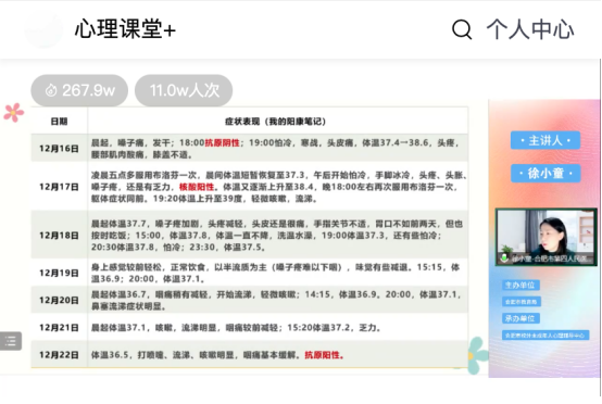 2022年12月30日,由合肥市教育局主办、合肥市校外未成年人心理辅导中心承办的“认识疫情新形势,守护‘心’健康”心理直播讲座如期开展。副主任医师、心理治疗师徐小童老师担任主讲,通过网络直播的方式,与中小学家长们聊一聊疫情新形势下的心理调适,直播互动热度达200多万。
